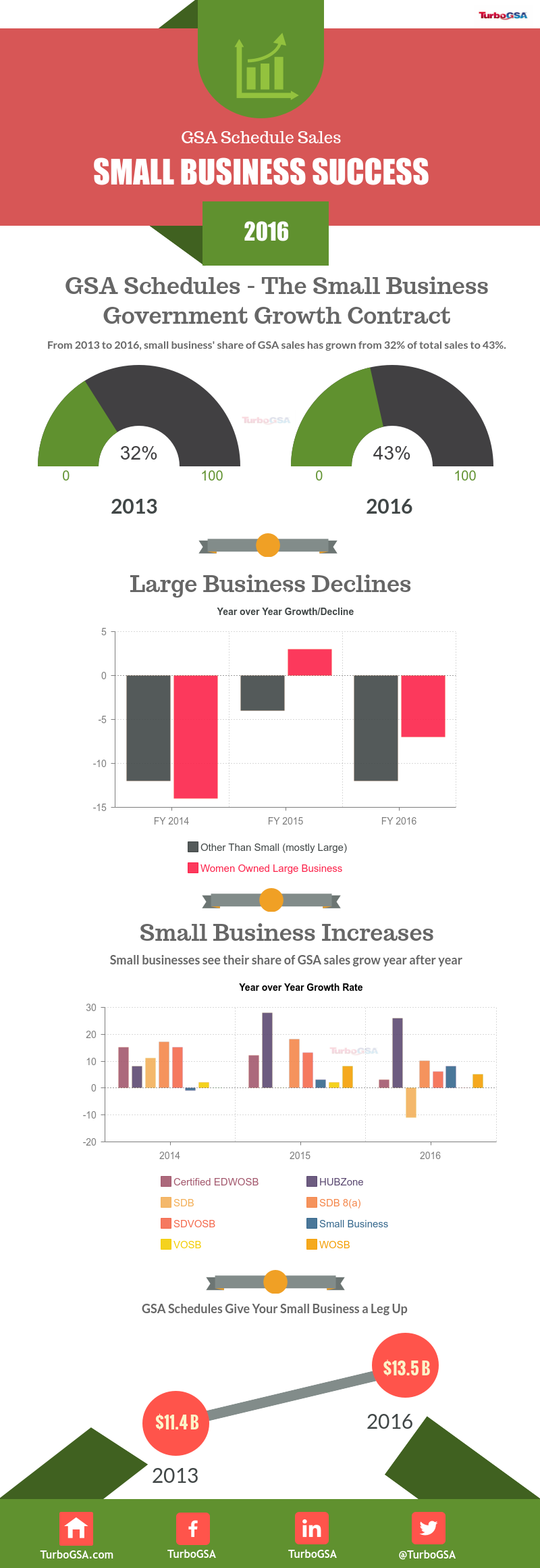 GSA Schedules have been a popular contract vehicle for large and small businesses alike, but in recent years, small business has grown its share of GSA schedule sales significantly since 2013. That year, the height of sequestration, cutbacks, and reduction of wartime spending, the small business share of GSA sales was 32%. For fiscal year 2016, that had grown to 43%; sales have grown from $11.4 billion in FY2013 to $13.5 billion in FY2016. Remarkable!